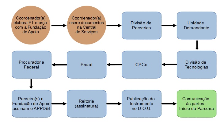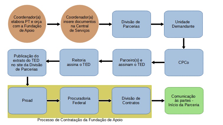 - Após a formalização do TED, incluindo a Plataforma TransfereGov, a Divisão de Parcerias providenciará o processo para a contratação da Fundação de apoio, conforme fluxo estabelecido pela Pró-Reitoria de Administração (ProAd).