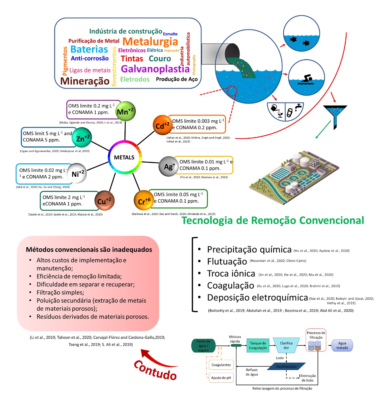 Figura 1. Foco principal do projeto: solucionar problemas causados pelos descartes de contaminantes oriundos de diferentes setores da indústria. Pretende-se superar as diversas tecnologias de tratamento de água, em especial para os sete contaminantes metais ilustrados.
