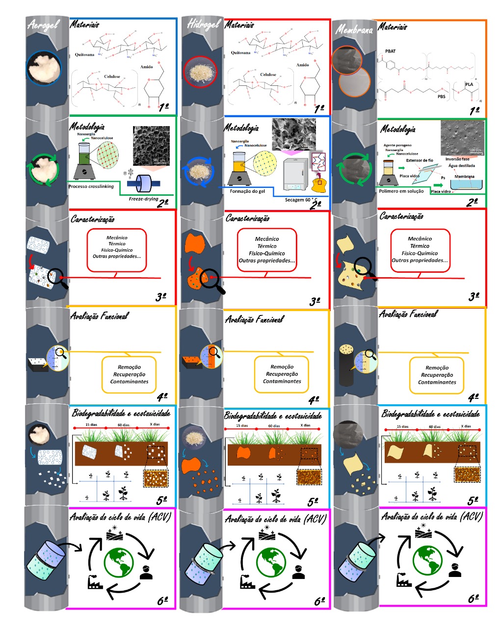 Será estudada a eficiência de adsorção e dessorção desses materiais, ou seja, de recuperação de diferentes íons metálicos (Cd2+, Cr6+, Cu2+, Mn2+, Ni2+, Zn2+), de modo que, após serem usados e descartados, possam reduzir seus impactos ambientais. Para aumentar sua capacidade de adsorção, os aerogéis, hidrogéis e membranas, preparados a partir de matérias primas biodegradáveis e/ou renováveis, serão incorporados com nanocelulose e nanoargilas de elevada capacidade de adsorção. Serão caracterizadas suas diferentes propriedades, desempenhos, biodegradação e ecotoxicidade, procurando investigar seus impactos ambientais do início ao fim na cadeia produtiva.