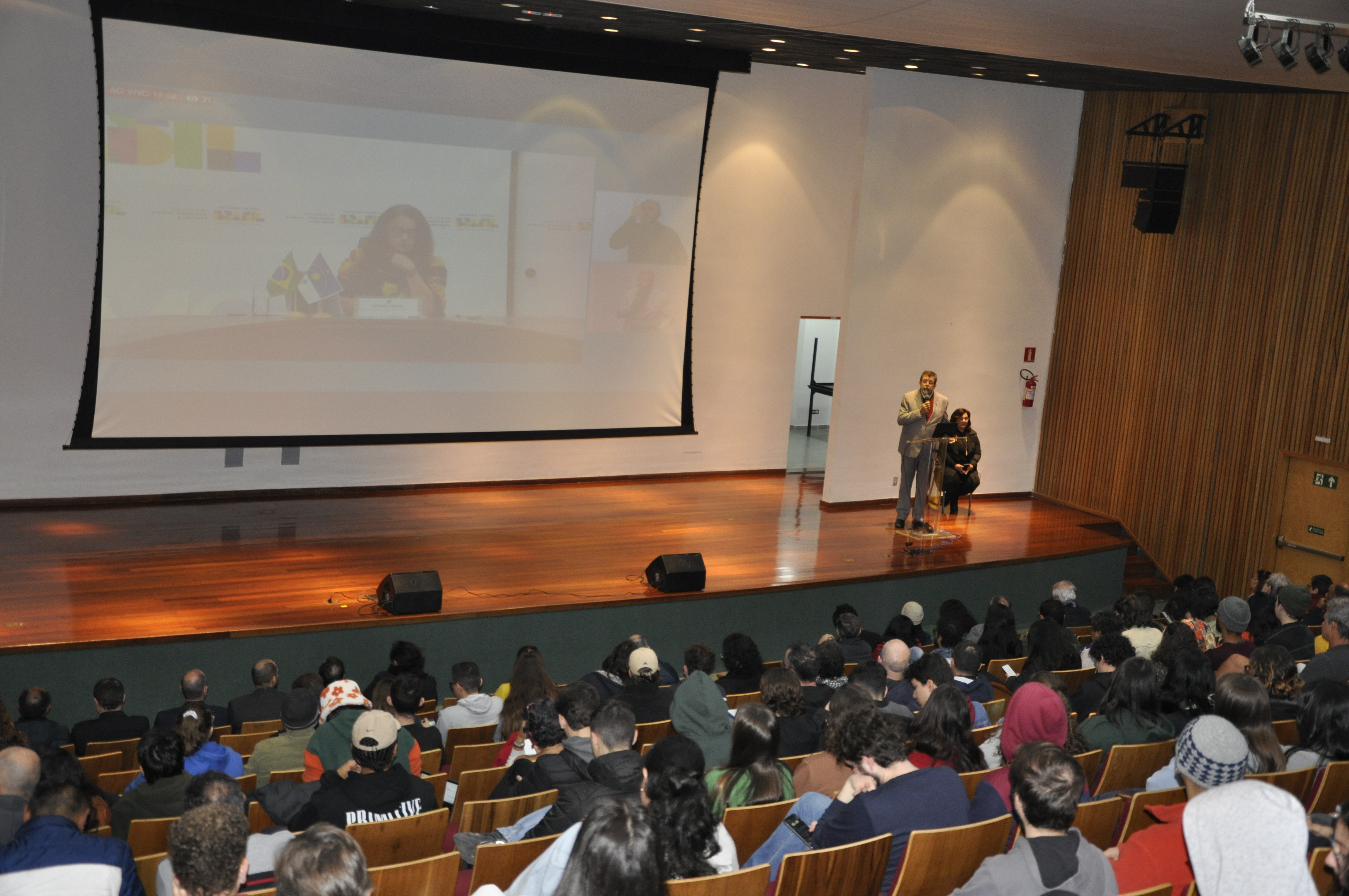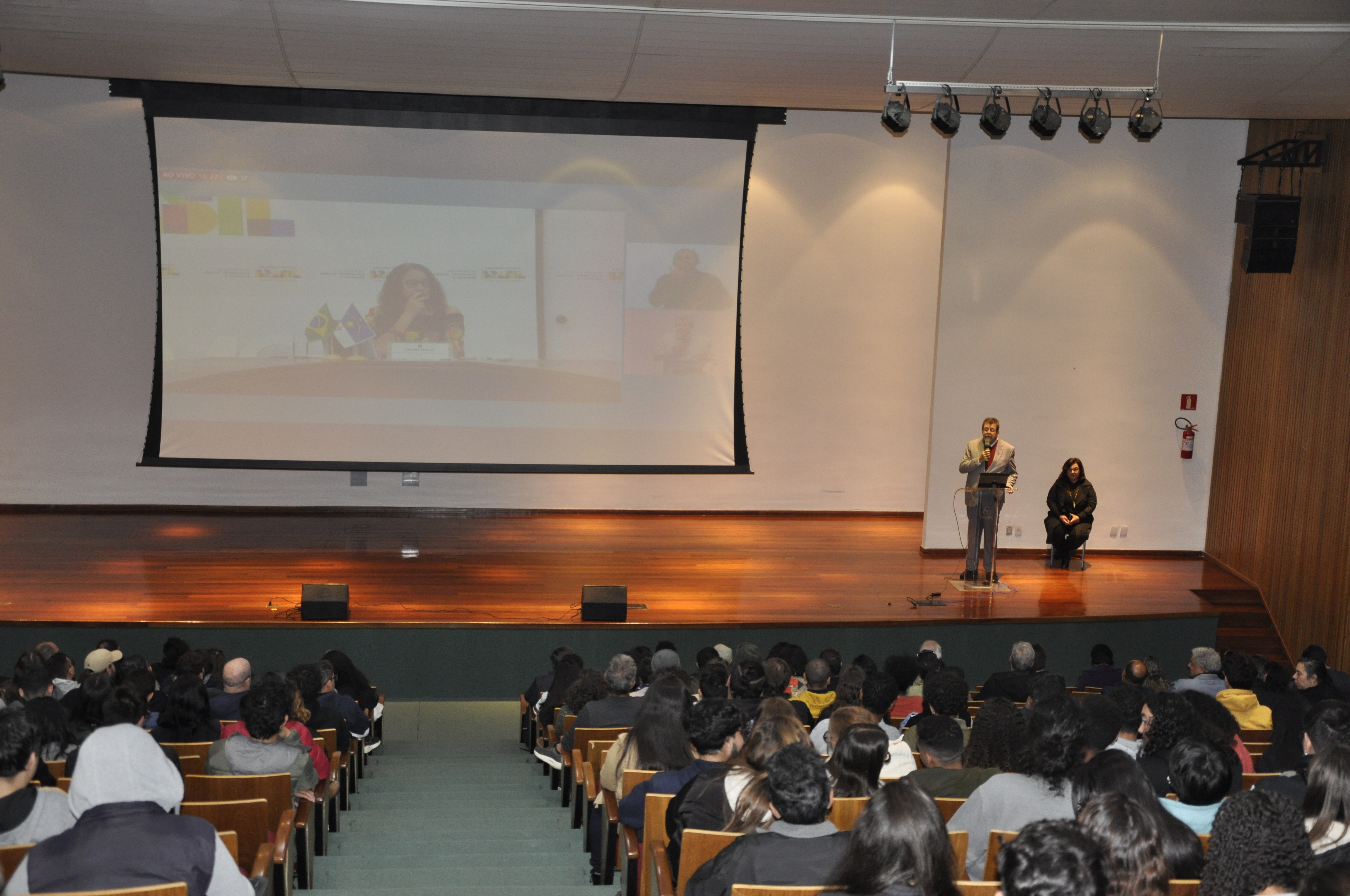 Ao final, a plateia pôde fazer perguntas à ministra, que as respondeu diretamente de seu gabinete em Brasília. Antes da ministra, o reitor da Universidade, Dácio Matheus, e a pró-reitora de Graduação, Fernanda Graziella Cardoso, fizeram suas falas de boas-vindas às e aos estudantes ingressantes de 2024.