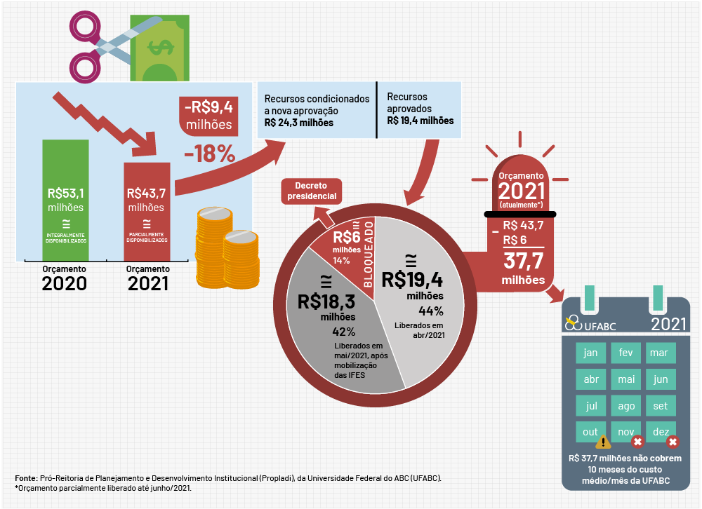 Além deste corte de 18%, que amplia as dificuldades orçamentárias acumuladas dos últimos anos e dificulta as possibilidades institucionais de manutenção dos serviços básicos na Universidade, um decreto presidencial ainda impôs um bloqueio adicional de 14% à LOA 2021.
