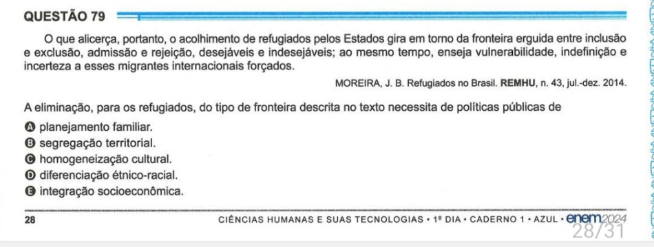 O trabalho, publicado na revista REMHU, aborda a integração de refugiados no país (”Refugiados no Brasil: reflexões acerca do processo de integração local”). O item da prova de Ciências Humanas e suas Tecnologias questionou o estudante (vide imagem) a respeito do tipo de política pública voltada para o assunto.