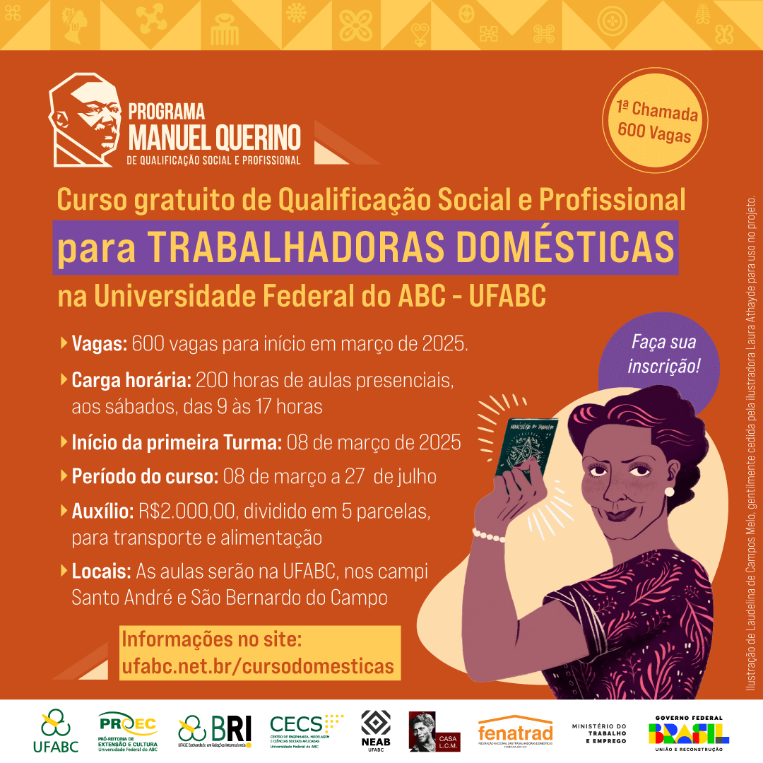 A Universidade Federal do ABC (UFABC) abre inscrições para o curso gratuito "Qualificação Social e Profissional no ABC: Trabalho Doméstico, Trabalho Mais que Decente". O projeto é financiado pelo Ministério do Trabalho e Emprego através do Programa Manuel Querino. Com o objetivo de qualificar trabalhadoras (es) domésticas (os) da região do Grande ABC, a iniciativa oferece, nesta primeira edição, 600 vagas e aborda temas como direitos trabalhistas, saúde, segurança no trabalho, e cidadania.