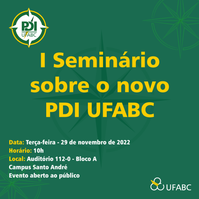 No próximo 29 de novembro, às 10h, no Campus de Santo André (Auditório 112-0), a comunidade universitária da UFABC poderá acompanhar o I Seminário sobre o novo Plano de Desenvolvimento Institucional (PDI) da Universidade.